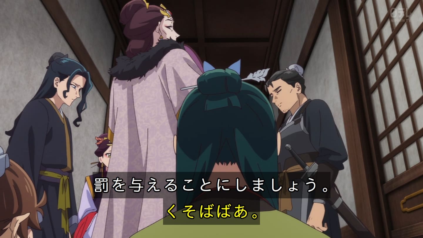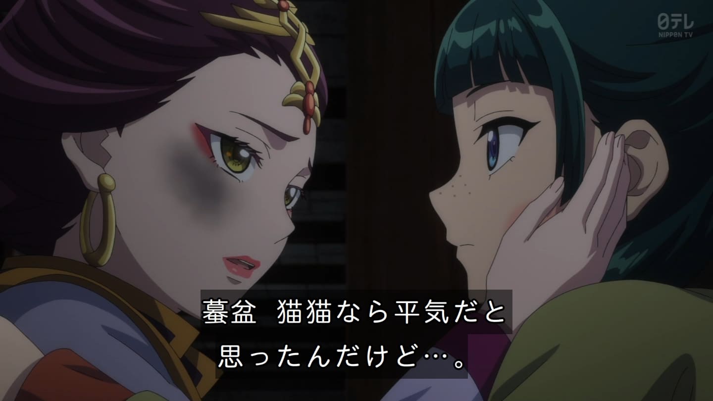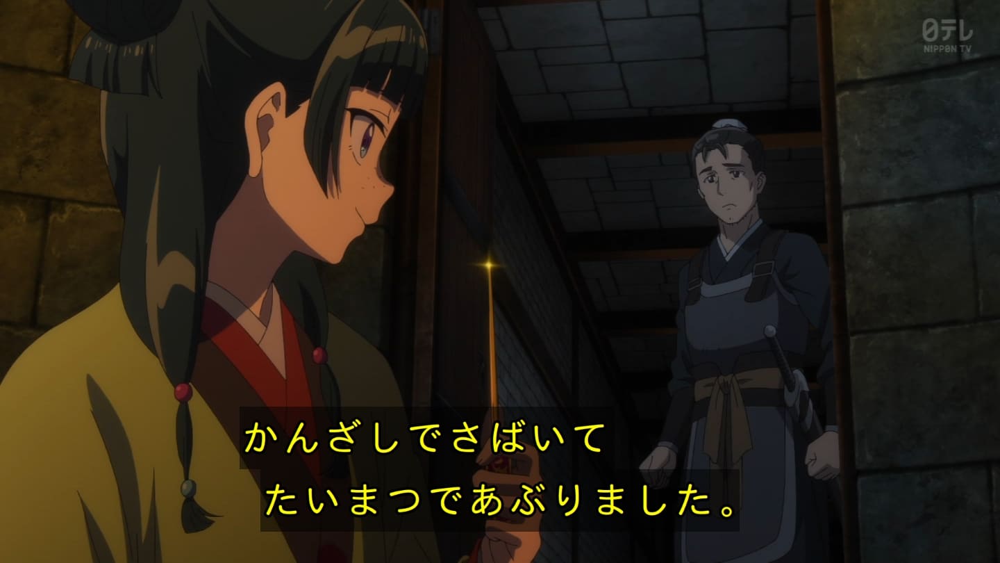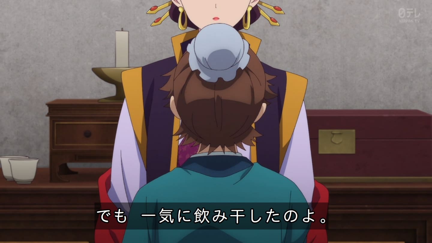 オスガキくんの騒ぎで翠苓さんが内々で収めようとしたら神美とかいうクソBBAが罰を与えようとするから結果猫猫が自ら名乗り出る事に。どっちにしてもダメやろ。タイボンって何だろうね。毒ヘビとかを牢内で放つ訳だけど猫猫には逆効果というか効果なしというか。でかば焼き喰ってたら見張りの兄ちゃんに助けられて火薬庫に来たら楼蘭妃が火を放ってた。祖母大宝かよ。大宝の娘が翠苓の母親か。皇族の血ね、先帝の方の。王母の流れを汲む子昌の子供楼蘭。オスガキたち毒殺されてた。早ない?響迂くんも中に。